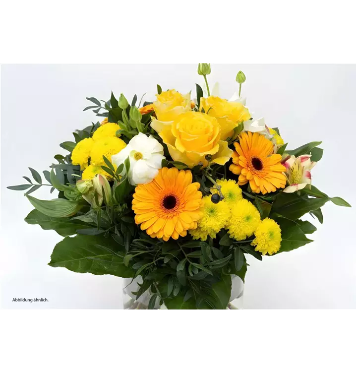 Dieser wunderschöne Blumenstrauß wird aus Blumen in Gelb- und Weißtönen gefertigt.