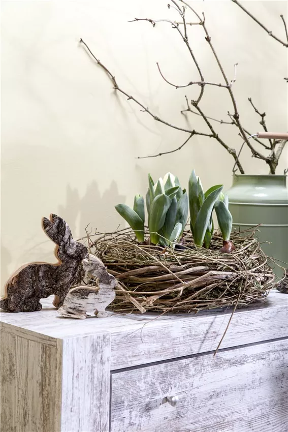 Tulipa Damit der Osterkranz ein Netz für die Frühblüher bilden kann, kommen die Zweige, der Ring und der Draht zum Einsatz. Zunächst wird der Ring aufgehangen, damit das Arbeiten leichter fällt. Dafür eignen sich Türklingen oder Garderobenhaken besonders gut. Dann werden die Zweige mit dem Draht um den Ring gebunden. Am unteren Ende des Ringes sollte ein kleines Körbchen entstehen, in das die Frühblüher später eingepflanzt werden. Der Osterkranz sieht besonders schön aus, wenn die Zweige oben dünn auslaufen. Das untere Körbchen lässt sich dann leicht mit den Händen auseinander schieben und formen.
