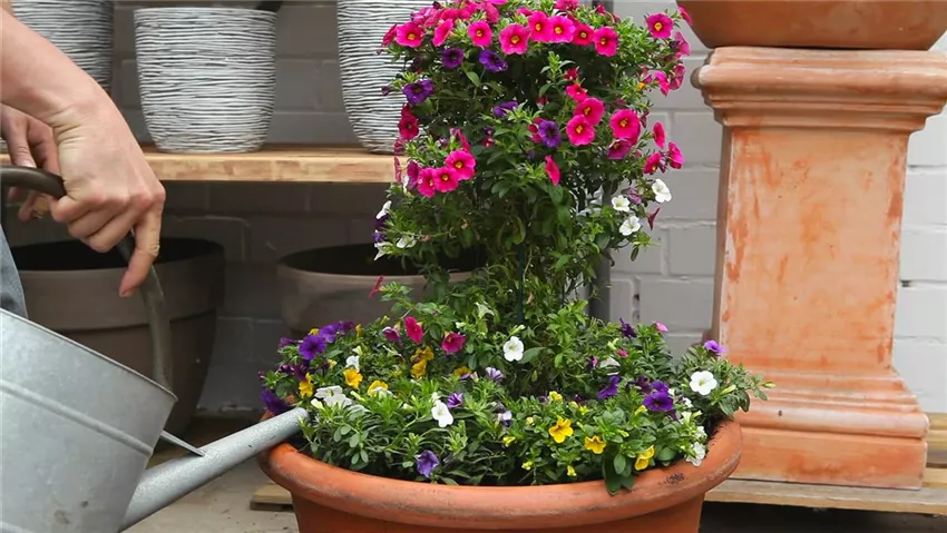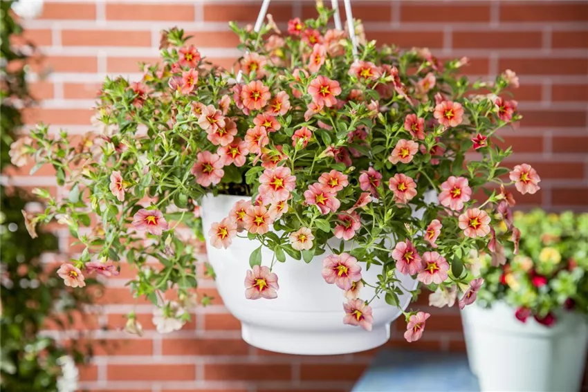 Calibrachoa Es ist immer interessant, mindestens zwei Pflanzen in einer Ampelschale zu beheimaten. Wichtig ist, dass sie die gleichen Lichtverhältnisse vertragen und den etwa gleich großen Durst haben. Gerade das Zusammenspiel verschiedener Pflanzen macht oft den optischen Reiz aus. Beispielsweise bilden Tagetes die Mitte, während kleine Farne rund um den Rand platziert werden und über ihn hinausranken. Ein anderer Tipp ist ein farbenfrohes Meeting von Petunien und Geranien. Wenn einiges über- und untereinander grünt und blüht, wird das Bild umso farbenfroher und munterer.