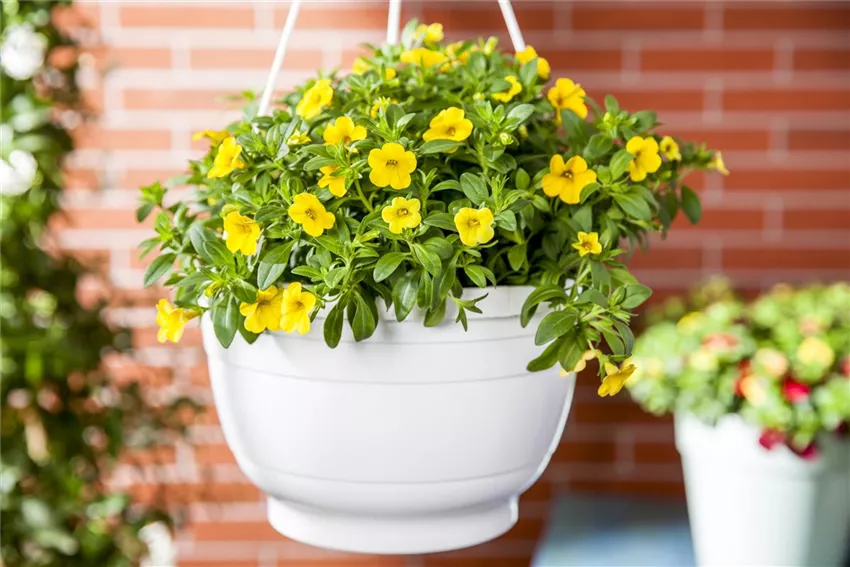 Calibrachoa Es ist rundlich und blüht bunt. Sein Skelett besteht aus einem Metall- oder Kunststoffkörper. Ausstaffiert ist es mit Moos, Zweigen, Leinen oder Folie und jeder Menge Erde. Das Wichtigste sind natürlich die Pflanzen, die im Idealfall die gesamte Oberfläche ausmachen und in alle Himmelsrichtungen wachsen. Wer die Inhalte sorgfältig in der richtigen Reihenfolge zusammenfügt, erhält zum Schluss das ganze Gebilde. Und das ist der Hanging Basket. Spitzenprofis sorgen sogar noch dafür, dass es auch aus der Unterseite des Behälters farbig hervorquillt. Das macht zwar mehr Mühe, aber auch mehr Freude, wenn das Gesamtergebnis sich als blühende Kugel zeigt.